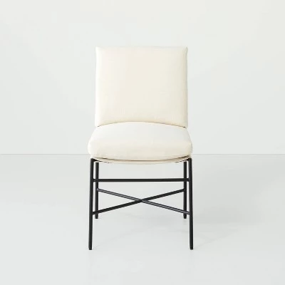 Add some industrial flair to your kitchen area or dining room with the Fabric & Metal Armless Dining Chair from Hearth & Handâ„¢ with Magnolia. Featuring a powder-coated black metal frame, this armless dining chair is paired with a cream textured cushioned seat and backrest for a pop of striking contrast and soft comfort. For improved balance and greater aesthetic appeal, the upholstered chair also incorporates stretchers and a crisscross pattern between its tubular legs.