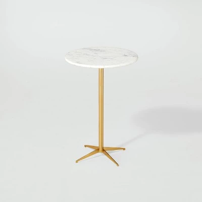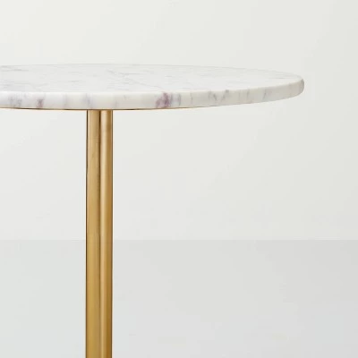 A grand combination of simple design and classic style, this Marble Top Accent Side Table from Hearth & Hand™ with Magnolia makes an elegant addition to your home. This round accent table stands on a brass-finish metal frame with a marble top for a sleek, stylish look. Place it alongside a white armchair in your living room or any other area to keep your belongings nearby, all while adding a decorative touch to your space.