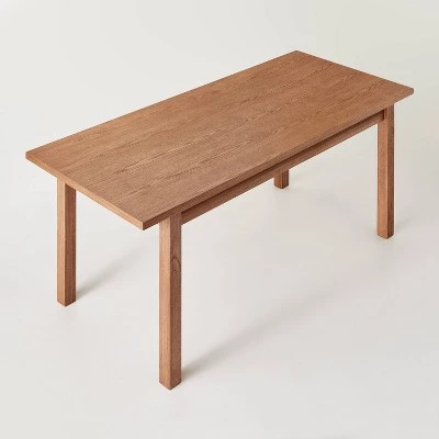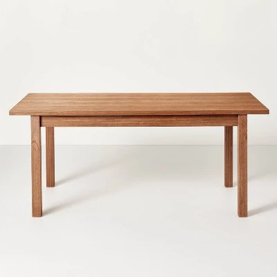 Add farmhouse charm to your home with this Plank Top Rectangular Wood Dining Table from Hearth & Hand™ with Magnolia. Crafted from rubberwood, this aged oak dining table with a lacquered finish easily integrates into your existing decor. Featuring a rectangle tabletop, this dining table is supported by four legs to create a simple yet appealing look — just add dining chairs of your choice to create a comfy family dining setup.