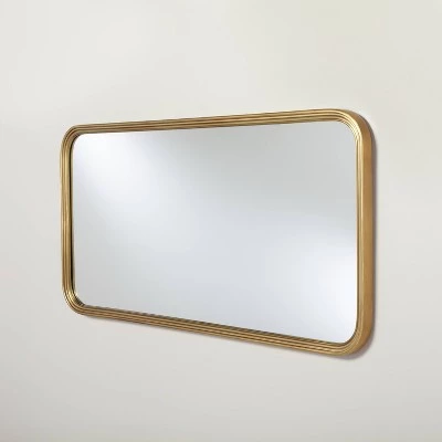 Decorate your home interiors with this Decorative Molding Rectangular Wall Mirror from Hearth & Handâ„¢ with Magnolia. This rectangular wall-mount mirror features a reflective glass center set in an antique brass frame for a nice decorative look. The beautiful mirror is easy to hang with included mounted hardware. Use this piece as a functional accent in your living room, bedroom or entryway to enhance the look of your space.