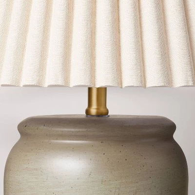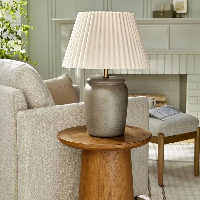 Bring decorative appeal to your indoor lighting with this Pleated Shade Ceramic Table Lamp from Hearth & Handâ„¢ with Magnolia. This beautiful table lamp features a gray ceramic base and comes with a pleated empire shade for a graceful, textured look. The one-way light setting with a rotary socket switch allows for easy operation. Place it on any side table next to your sofa in your living room, or on a nightstand in the bedroom for warm lighting.