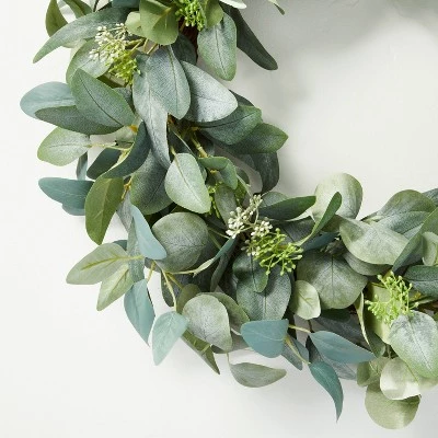 Bring a touch of green to any room in your home by hanging up this Faux Mixed Eucalyptus Wreath from Hearth & Handâ„¢ with Magnolia on a wall. Made with woven strands of faux-eucalyptus and seeded accents that have realistic green coloring and detailing, this round wreath has a simple and clean design that pairs seamlessly with a variety of different decor styles. This faux-eucalyptus wreath also has a lightweight design that makes it easy to hang and display for a crisp touch of greenery.