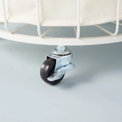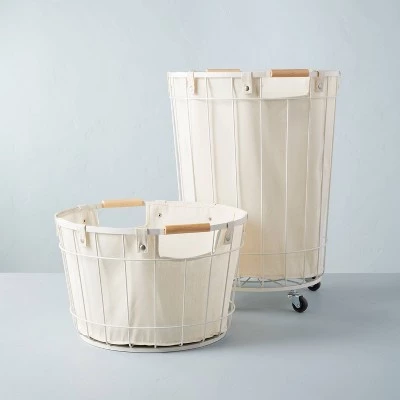 Make laundry day less stressful with this Wire & Fabric Laundry Hamper from Hearth & Handâ„¢ with Magnolia. Designed in a round silhouette with a wired metal frame, this laundry hamper features a soft inner fabric liner to keep your laundry hidden from view. The open-top design comes in handy for sorting through laundry, while the two side wooden handles make it easy to carry. Featuring a white metal frame with a cream fabric liner and natural wooden handles, this laundry basket brings a dash of style to your laundry room.