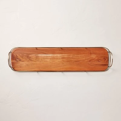 Add a decorative accent piece to your home decor with the 32-Inch Wooden Decorative Tray with Metal Trim from Hearth & Hand™ with Magnolia. This rectangular tray features rounded corners to add a bit of style. Made with wood, this decorative tray is designed with metal trim in a brass finish for a mixed-material touch and classic style that suits any aesthetic well.