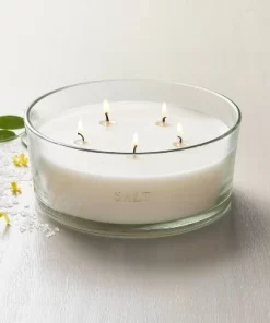 Transport your senses seaside with the 5-Wick Clear Glass Salt Knob-Lid Jar Candle from Hearth & Hand™ with Magnolia. This clear glass jar candle is designed in a round bowl shape and has a gold-tone lid with a knob for extra visual appeal. Elegantly made with soy, paraffin and palm wax, this five-wick candle features a delightful sea salt scent, and it’s designed with a burn time of around 40 hours for lasting use.