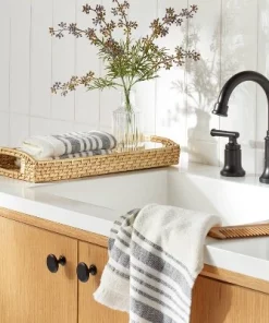 Bring organization to your bath essentials with this Natural Woven Bathroom Tray from Hearth & Handâ„¢ with Magnolia. This rectangular bath tray features an open-top design with a flat base that makes it perfect for organizing different shampoo, body wash or face wash bottles for a clutter-free look. Showcasing a rattan construction for natural flair, it’s sure to add a touch of style to your bathroom counter.