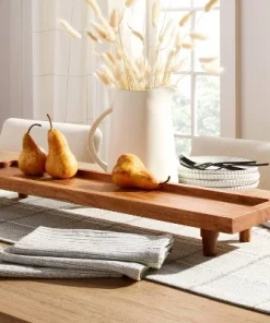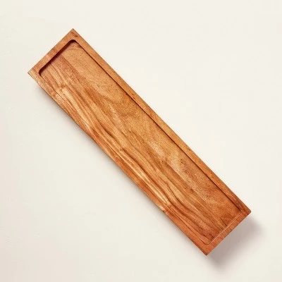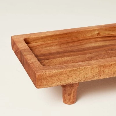 Present and serve food items in style with this Footed Wood Serving Board Brown from Hearth & Hand™ with Magnolia. This rectangular serving board makes a great addition to your entertaining spread. It features a footed design in a brown acacia wood finish for natural appeal that easily pairs with any table decor. This serving stand is perfect for serving various cheeses, chopped fruit, cupcakes, cake slices or other goodies. Plus, it can be spot cleaned for easy care.