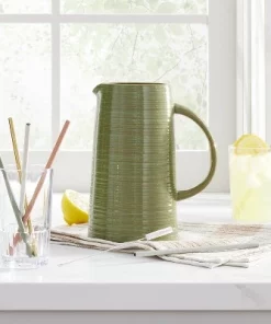 Serve drinks in style with this Ribbed Stoneware Beverage Pitcher from Hearth & Hand™ with Magnolia. This stoneware beverage pitcher features a ribbed design in brown on a green background for rustic charm, while the glazed finish adds eye-catching flair to it. Suitable for serving both hot and cold beverages, it features an easy-to-pour spout for effortless pouring, while a rounded side handle makes it easy to hold or carry.