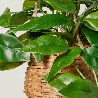 Create a life-like green display in your indoor space with this Faux Hoya Hanging Plant from Hearth & Hand™ with Magnolia. This hanging plant arrangement showcases a trailing faux foliage of green hoya leaves housed inside a brown rattan pot for a natural look. The artificial construction requires no maintenance and can be displayed year round, and the included jute rope with a top loop allows for easy hanging from the ceiling.
