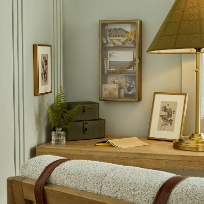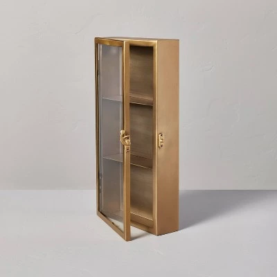 Bring a touch of antique style to any wall in your home with this Decorative Brass Display Case from Hearth & Handâ„¢ with Magnolia. This decorative display case features a wall-mount design that allows it to be easily hung on any wall with two hooks. Made of metal frame, it features three shelves for displaying flower pots, framed photos, paintings and more, while the swingable clear door with a latch makes it easy to open or close to add, remove or adjust the contents.