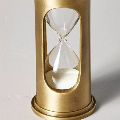 Keep time in classic style with this Decorative Brass Hourglass from Hearth & Handâ„¢ with Magnolia. Set inside a metal frame with a brass finish, this decorative hourglass features two glass phials connected by a narrow neck to let sand slip in a regulated manner from the top phial to the bottom one. Compact in size, you can use it to decorate your desk, side table or mantel for elegant style.