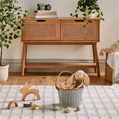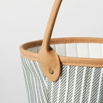 Welcome Easter in sweet style with this Fabric Easter Basket with Faux Leather Handle from Hearth & Hand™ with Magnolia. Designed in a bucket shape, this decorative basket features an open-top design for easily stashing or picking items from the inside. Featuring a green woven design with white horizontal stripes, it brings cute style to your Easter decor, while a single tote handle makes it easy to carry.