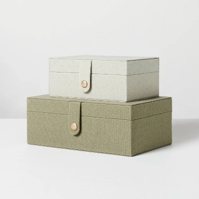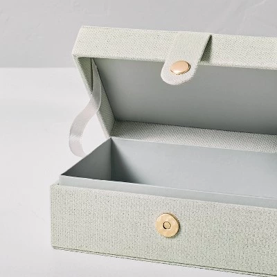 If you’re looking for a practical and stylish storage solution, this Fabric Storage box from Hearth & Hand™ with Magnolia makes a perfect pick. Made from MDF with fabric coating, this rectangular storage box features a single compartment with a shiny snap closure. Great for neatly storing office supplies, small notebooks and more, it pairs well with other storage boxes and desk decor.