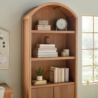 Keep books standing straight and looking tidy on your shelf with these charming Metal Wire Decorative Bookends from Hearth & Handâ„¢ with Magnolia. This set of two matching decorative bookends features an iron construction and an antique brass finish for a look that easily coordinates with a variety of decor schemes and shelf styles. The bookends are great for propping up books on a shelf with some open space, or for standing up a row of books on a wall shelf or desktop. Plus, the pretty metal wire design allows you to see most of the book cover through the bookend.
