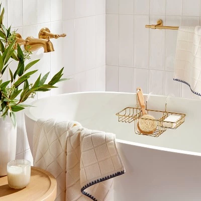 Keep bath essentials ready at hand with the Over-the-Side Wired Bathtub Caddy from Hearth & Handâ„¢ with Magnolia. This brass-finish bathtub caddy is made with metal in a wired design for a stylish look that suits your bathroom setting well. Easy to hang, this metal bathtub caddy makes a functional addition to your bath space.