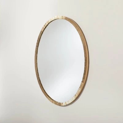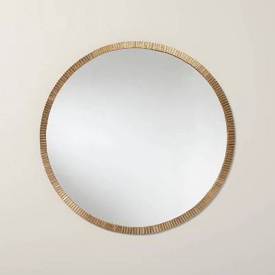 Let your design style be a reflection of you with this Pleated Brass Round Wall Mirror from Hearth & Hand™ with Magnolia. This round wall-mount mirror features a pleated metal frame with an antique brass finish for classic style. Use this mirror as an accent in a bedroom, entryway or bedroom for a functional piece that makes a statement.