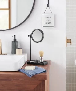Add style and functionality to your bath space with this Vanity Hand Mirror with Tray Base from Hearth & Handâ„¢ with Magnolia. Designed with a metal frame in a powder-coated matte finish, this vanity mirror stands on a rod set on a tray base to help keep your accessories within reach. The round mirror comes with a convenient swivel feature to make it easy to move while applying makeup or during your morning skin regime. Place it on the countertop alongside sink and hang a round metal-frame mirror on the wall for a coordinated spa look in your home bath.