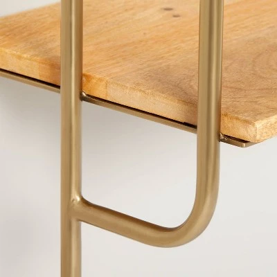 Add a decorative accent to your home decor with the Wood and Brass Decorative 3-Tier Wall Shelf from Hearth & Hand™ with Magnolia. This wall shelf features three wooden shelves and a brass-finish metal frame for an elegant look. Designed with open shelves, this decorative shelf is perfect for displaying vases, baskets and other items.